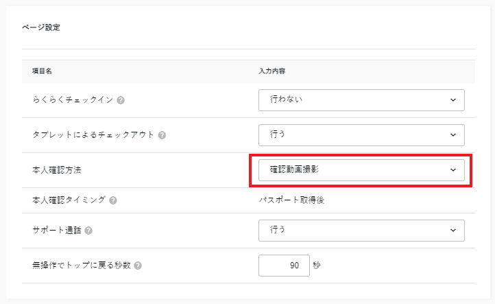 〖ページ設定〗欄にて、[本人確認方法]を「確認動画撮影」にします。