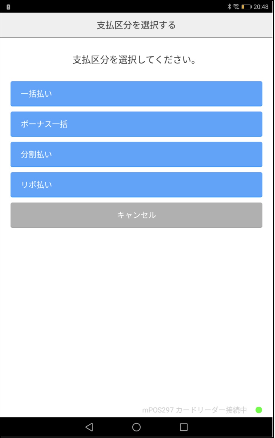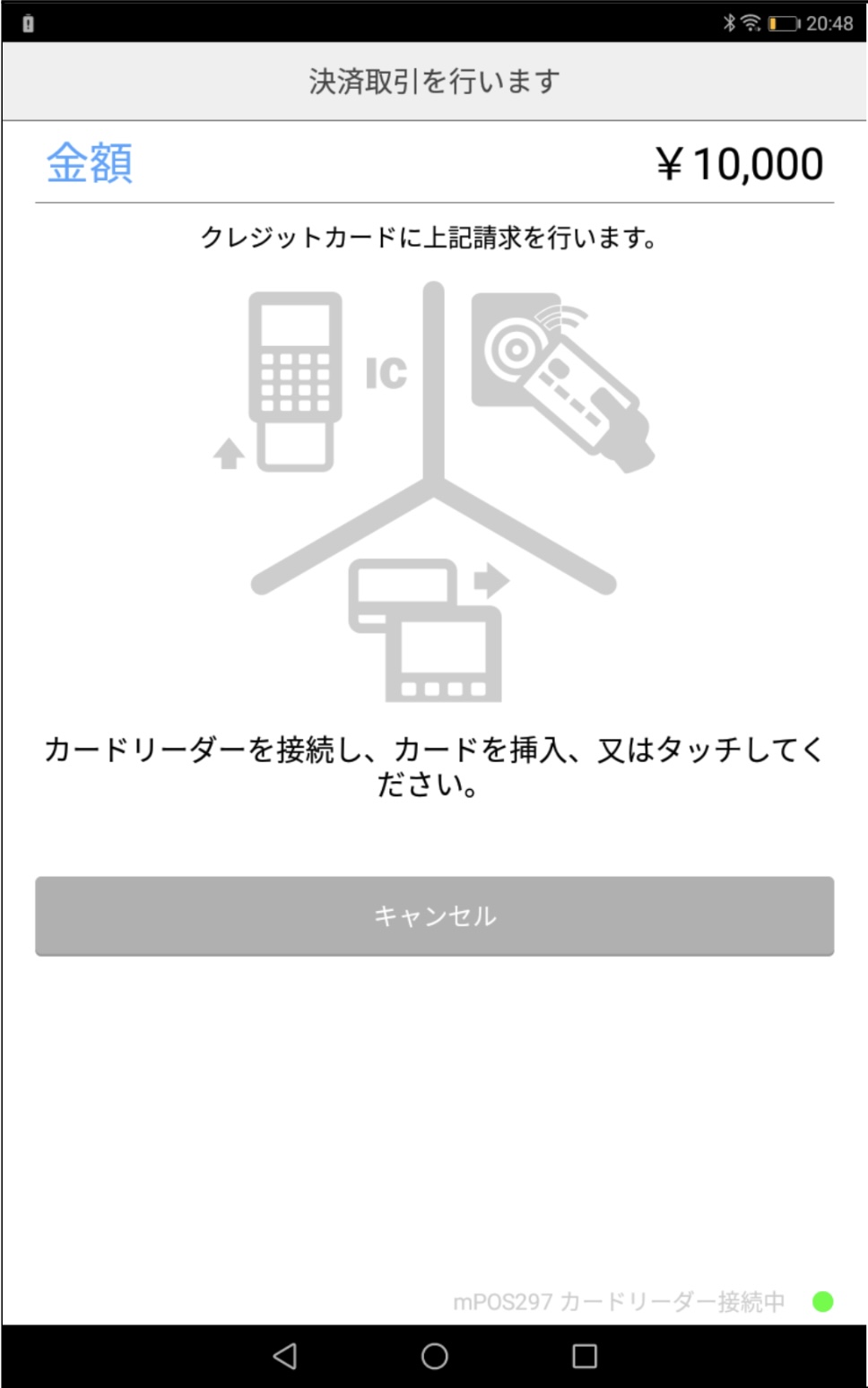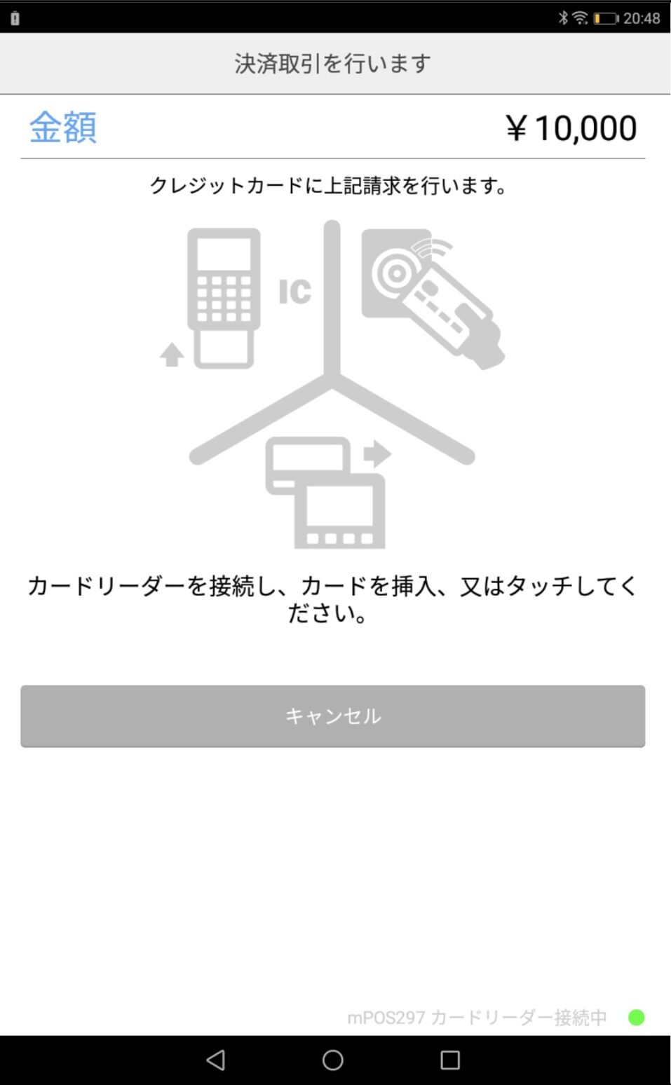 タブレットで実際にクレジットカード決済をお試しいただくとmPOSが起動します。(実際に決済完了までさせる必要はございません。)