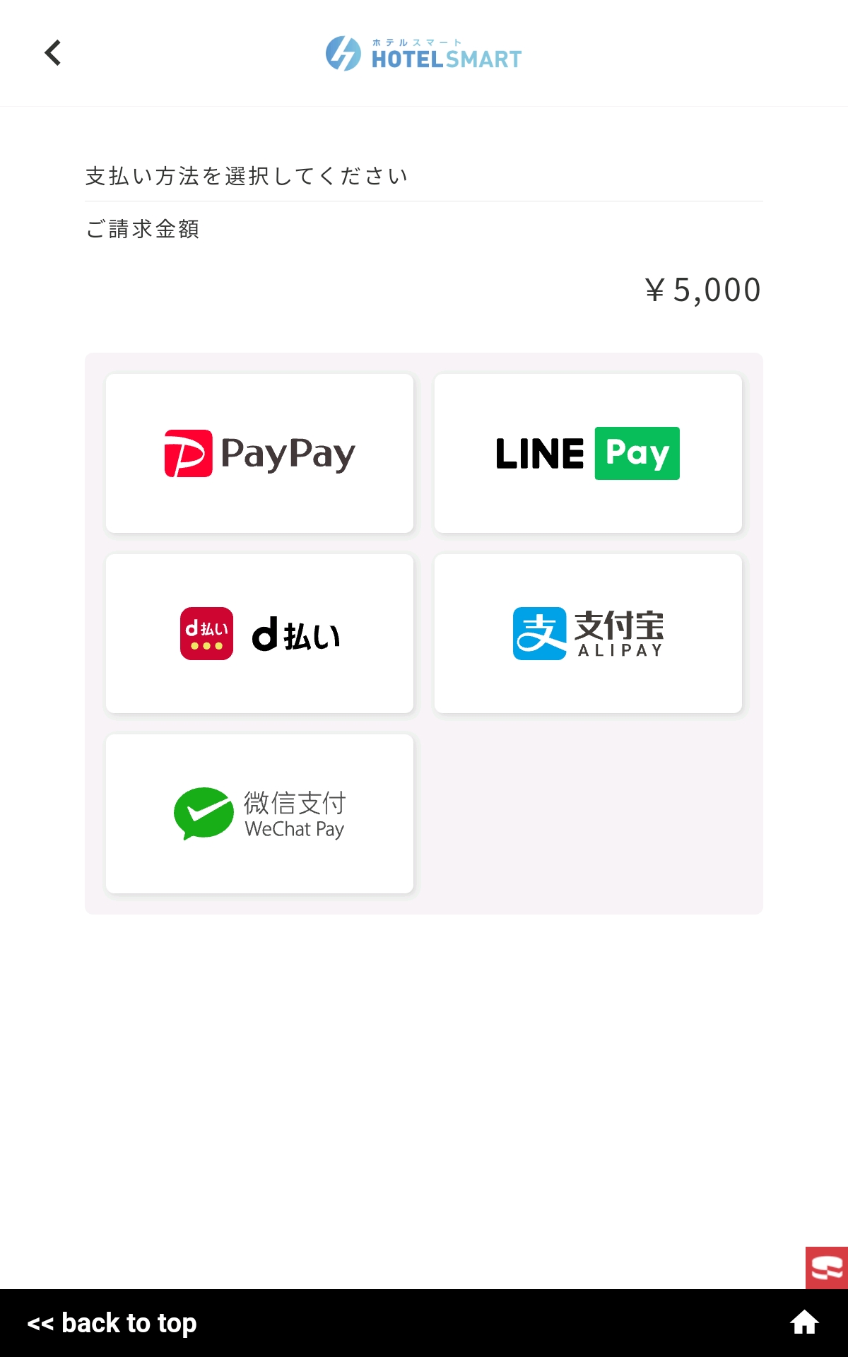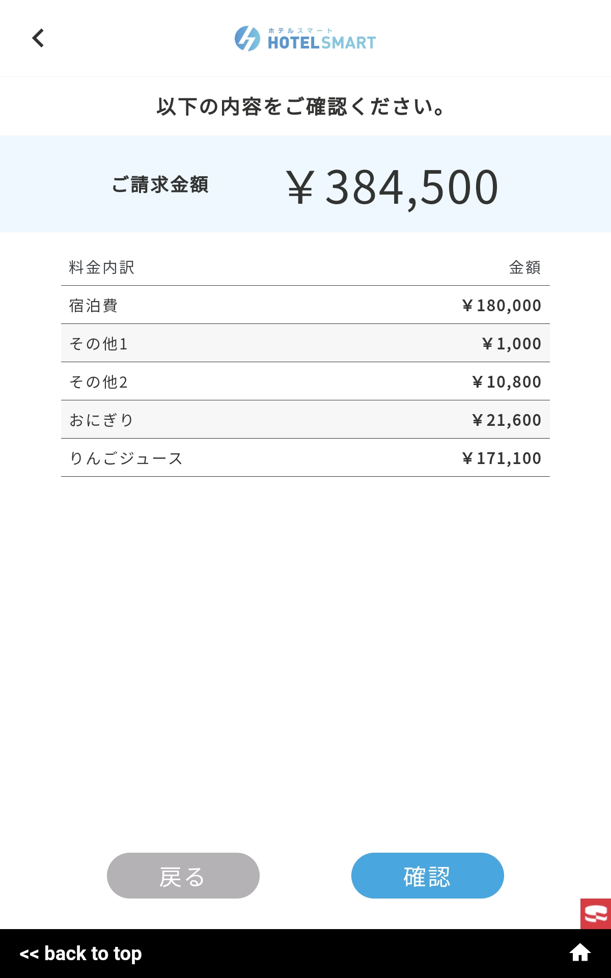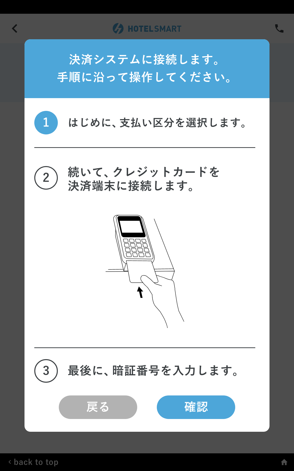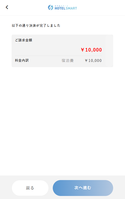 チェックイン時は(宿泊者情報入力後、チェックイン完了前)、チェックアウト時は、(チェックインコード入力後、チェックアウト完了前)に以下の流れで決済をします。