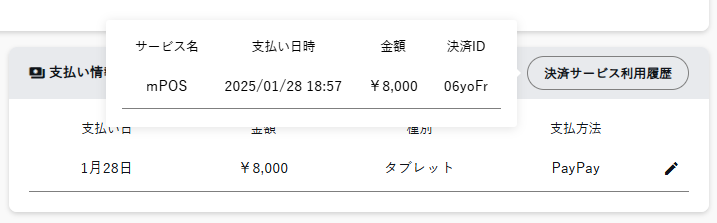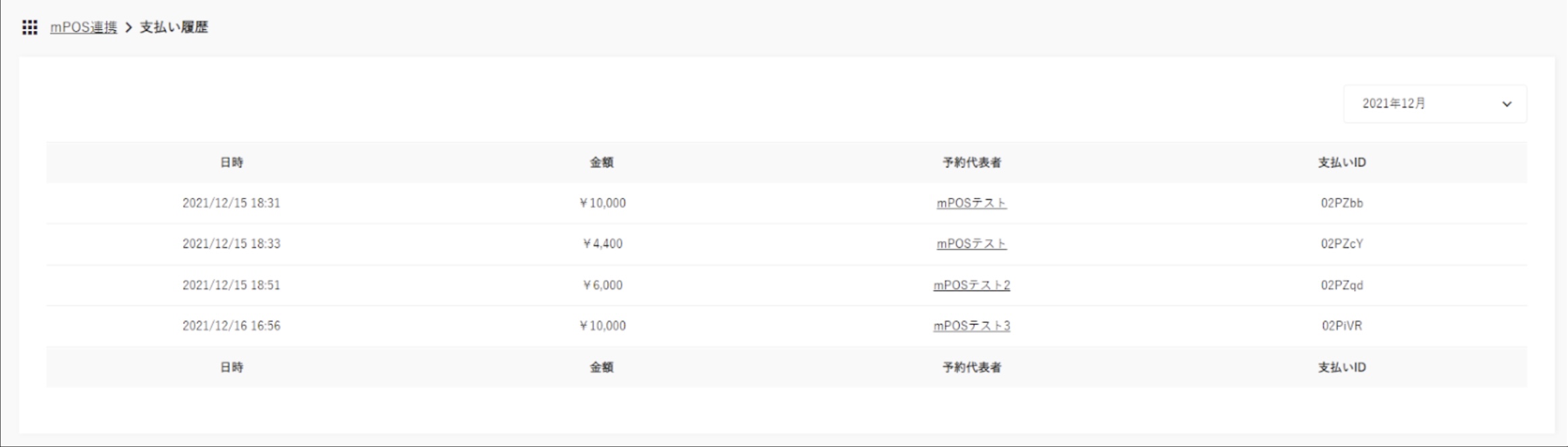 オプション機能>mPOS「設定ページへ」>「支払い履歴を表示」 から支払い履歴一覧を確認できます。