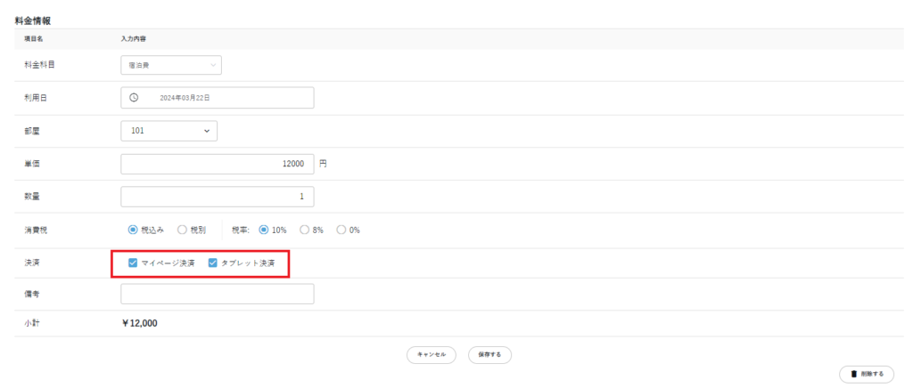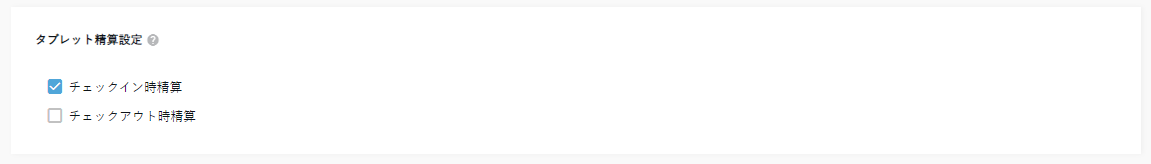 チェックイン時/チェックアウト時に決済させる(*1)場合は「タブレット決済」にチェックを入れます。