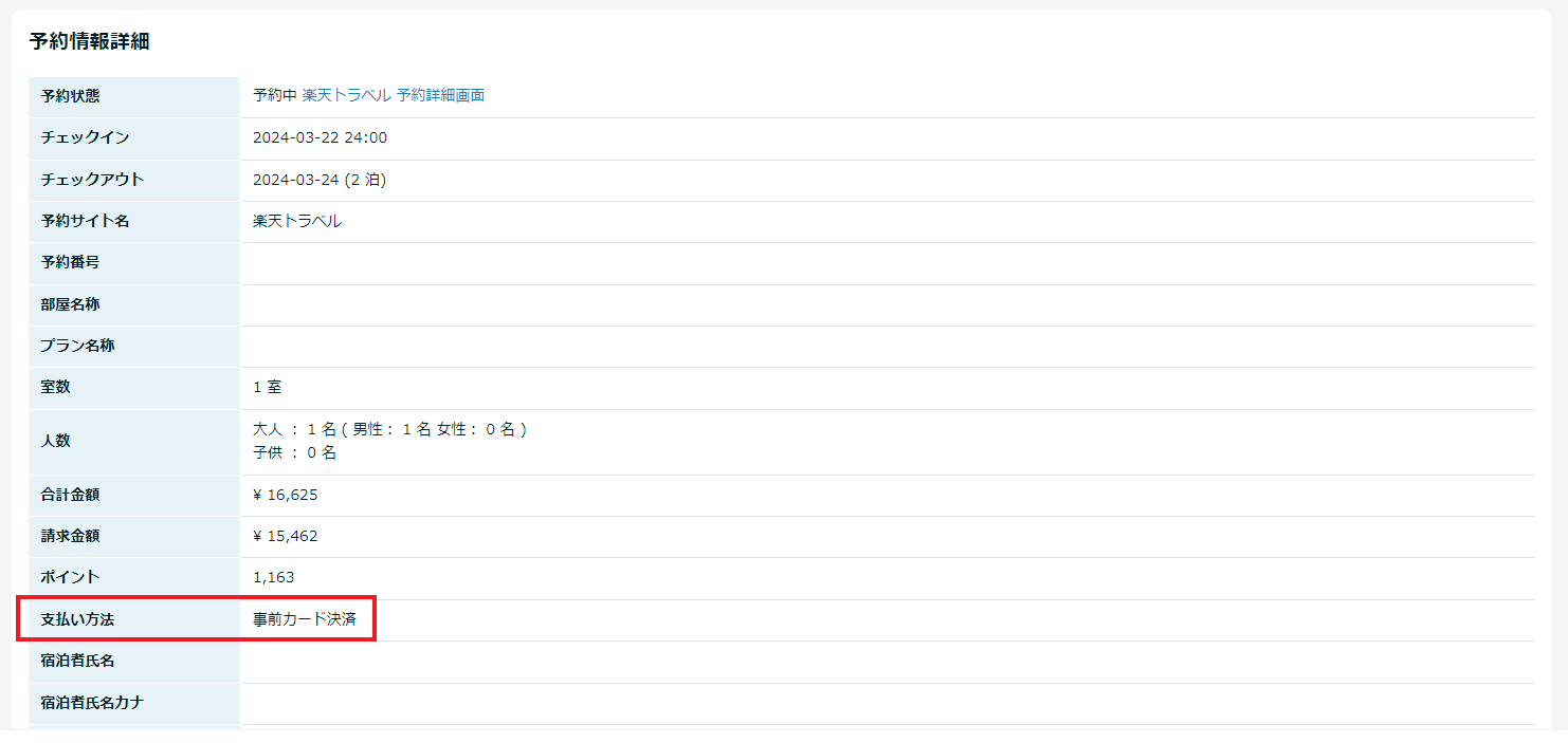 該当予約の詳細ページの〖支払い情報〗欄の「決済サービス利用履歴」より決済日時と決済IDが確認できます。