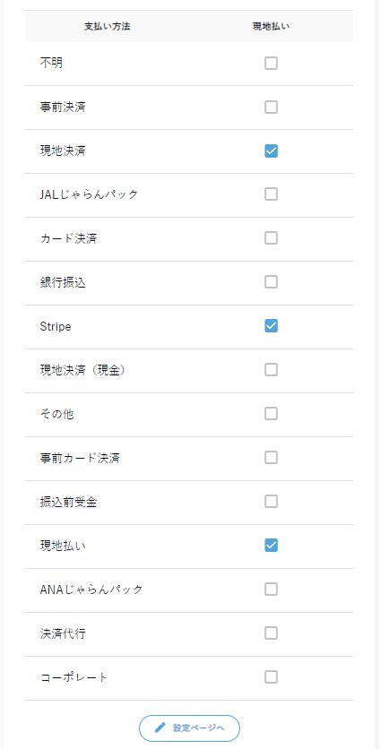 ②「設定ページへ」にアクセスし、現地決済が必要な(未収とする)支払い方法に対して✓を入れる