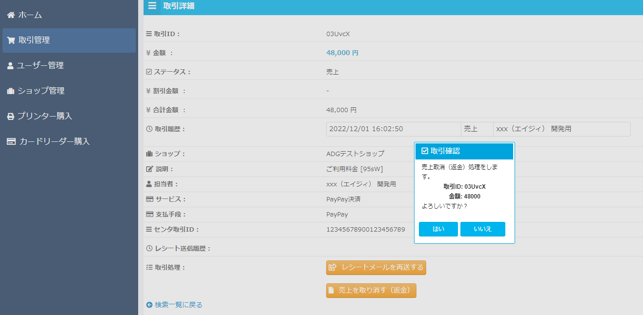 ②取引詳細の「売り上げを取り消す(返金)」ボタンを押すと返金処理が行われます。