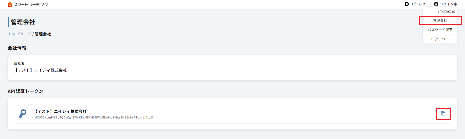 画面右上「ログイン中」をクリックし、管理会社を選択するとAPI認証トークンが表示されます。