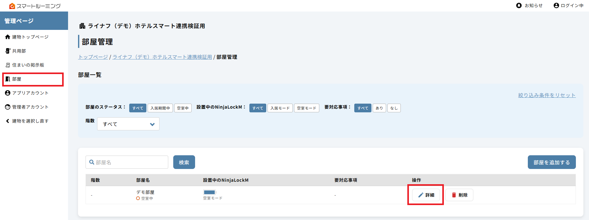 連携が完了すると、NinjaLockM連携の物件詳細ページが表示されます。