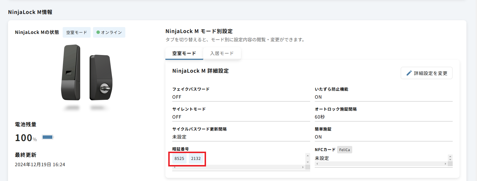 また、スマートルーミングの【部屋情報(部屋>詳細)】の〖NinjaLock M情報〗の「空室モード」にて、発番された鍵番号を確認いただけます。