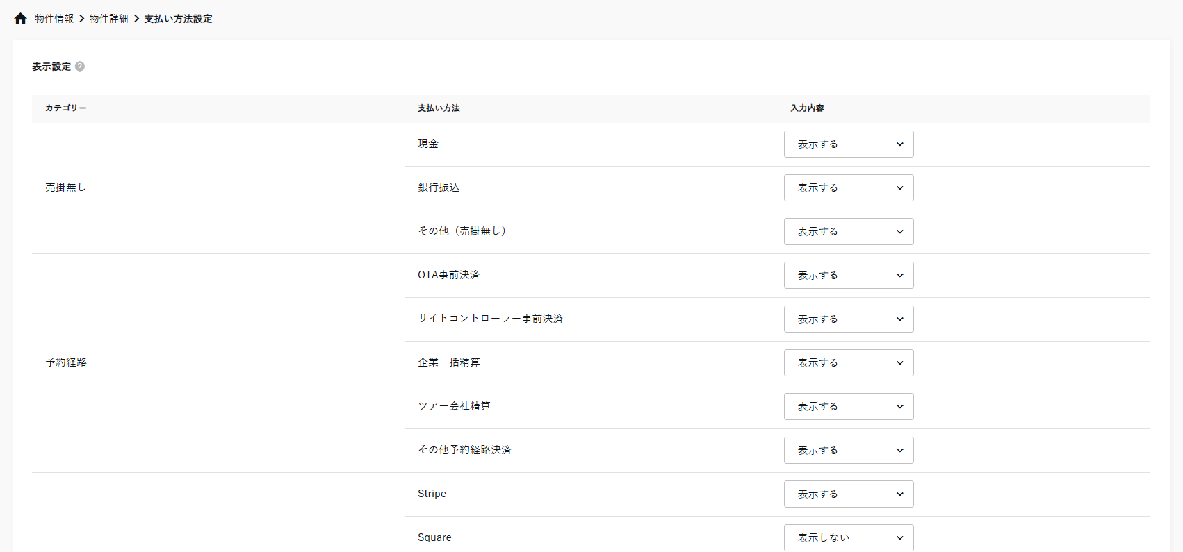 施設で受付可能な支払い方法のみ「表示する」設定にし、それ以外は「表示しない」に変更しましょう。