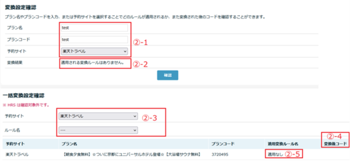 ②-1 「プラン名」、「プランコード」を入力、または「予約サイト」を選択して設定を確認できます。