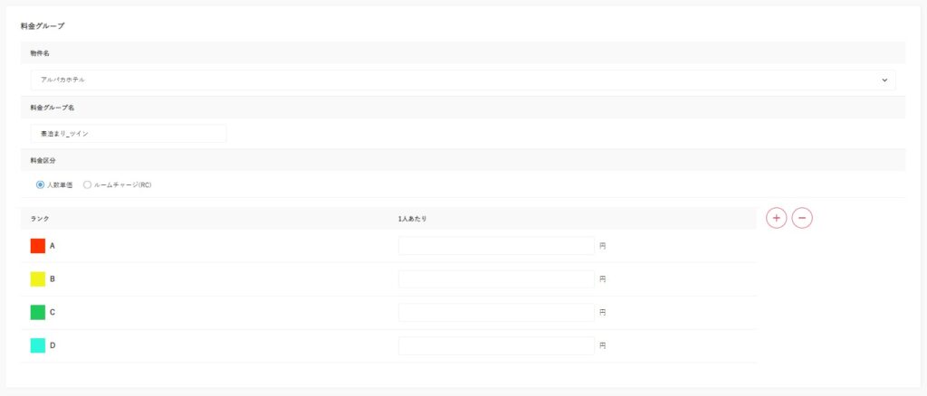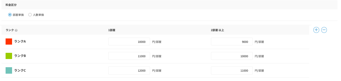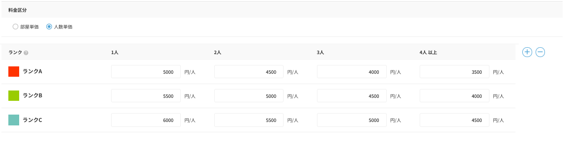 部屋単位の場合は一部屋あたりの料金、人数単位の場合は一人あたりの料金を入力しましょう。