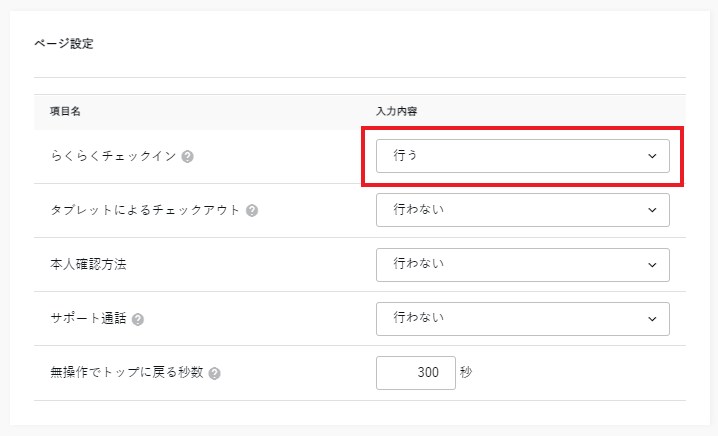物件管理>物件情報>【タブレット表示設定】にて、〖ページ設定〗の[らくらくチェックイン]を「行う」にします。