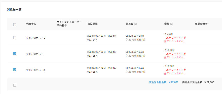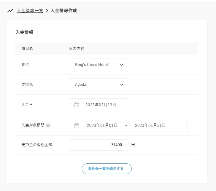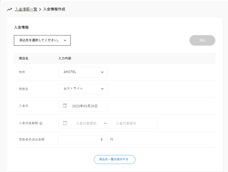 ③入金情報の下部に消込先一覧が表示されるので、内容の確認/選択する