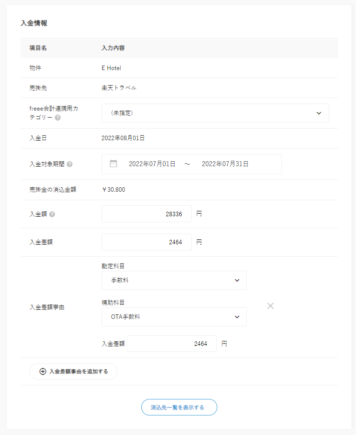 消込金額の内訳として、売掛先からの入金額と売掛先に支払う手数料を登録できます。