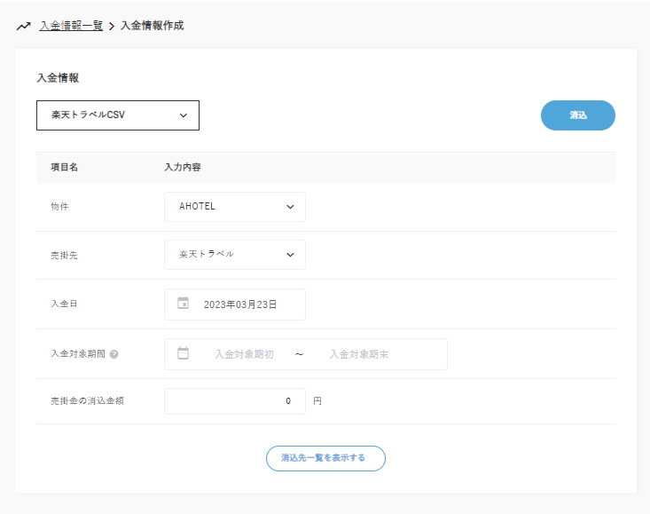 ②物件・売掛先・入金日を入力し、「消込先を選択してください。」からアップロードするCSVを選択します。
