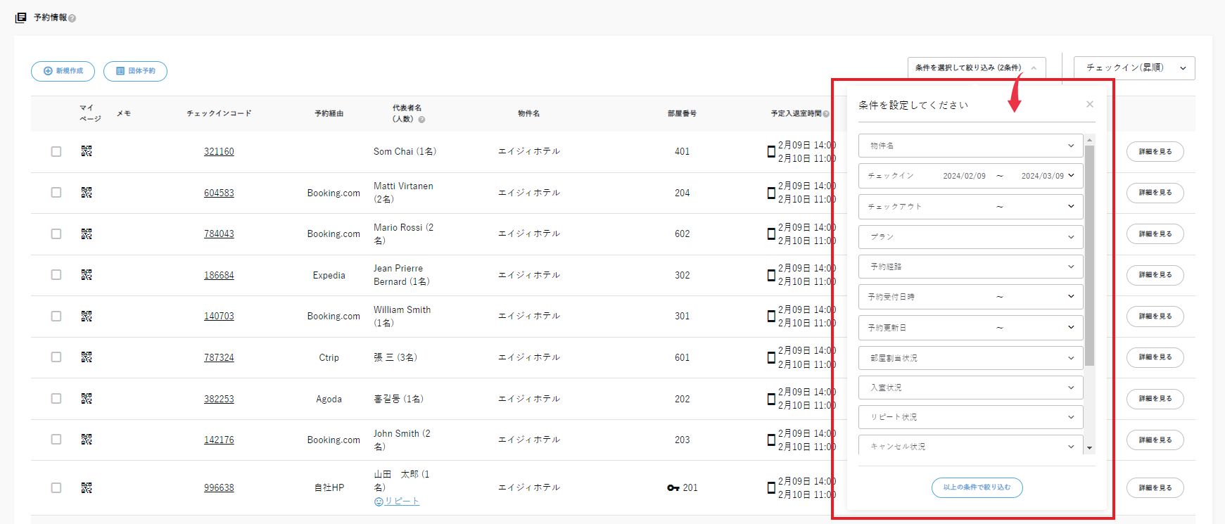 「仮予約」「未チェックイン」「宿泊中」「チェックアウト済み」から選択