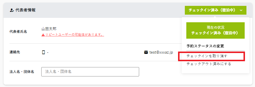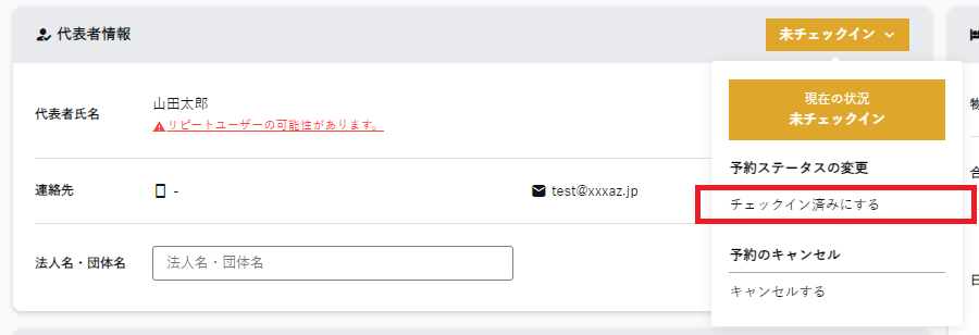 〖代表者情報〗欄にて、ステータスをクリックし「チェックイン済みにする」/「チェックアウト済みにする」をクリックします