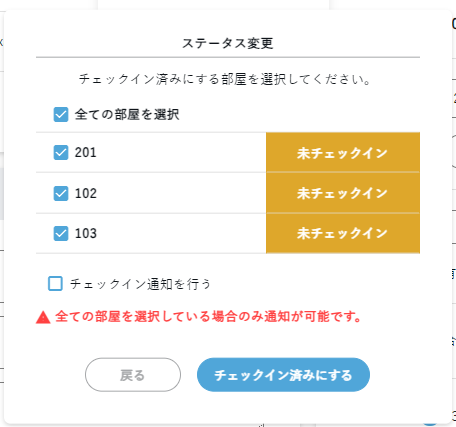 ステータスを変更する部屋の選択をして「チェックイン済みにする」/「チェックアウト済みにする」をクリックします
