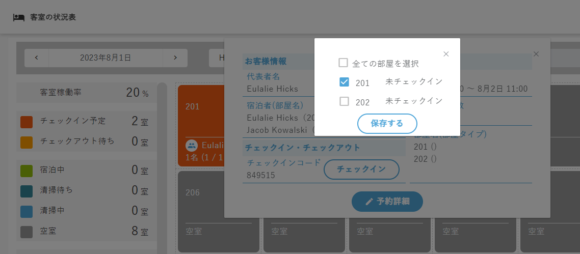 他の部屋も同時にチェックイン/アウトする場合は、[全ての部屋を選択]や該当の部屋にチェックをいれ、「保存する」をクリックします