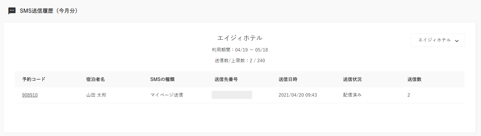 画面右上のアカウント名>アカウント名>SMS送信履歴 にて今月分の送信数および、送信履歴をご確認いただけます。