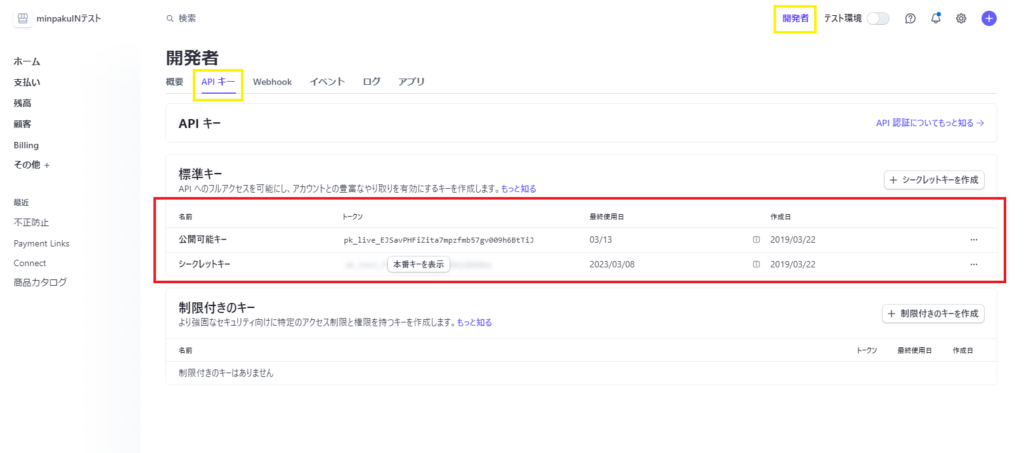 キーはStripe管理画面の(開発者>APIキー)にて確認できます。