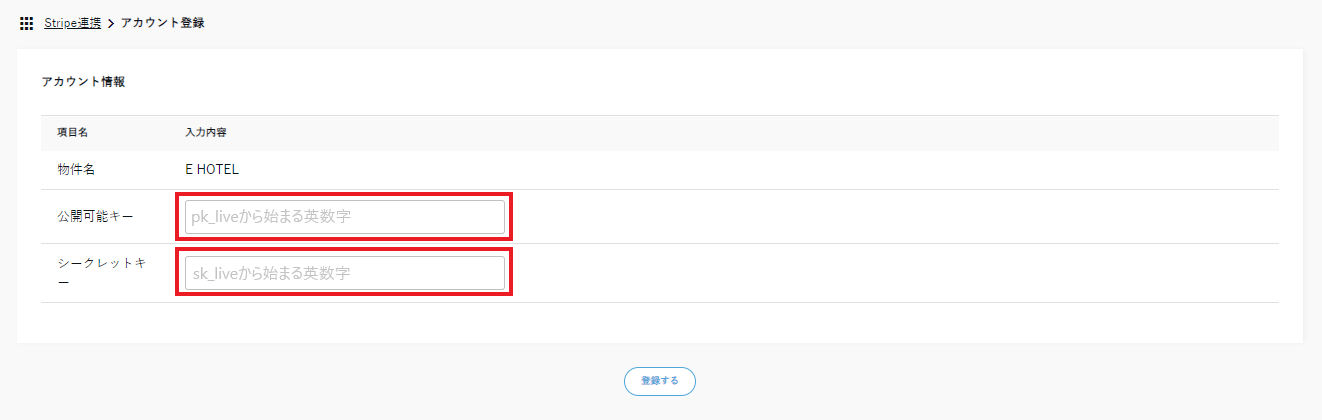 ②Stripe管理画面からコピーした公開可能キーとシークレットキーを入力し「登録する」をクリック
