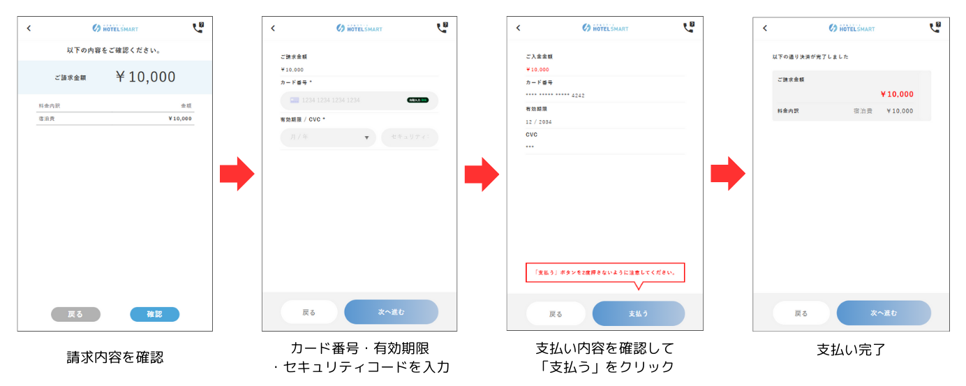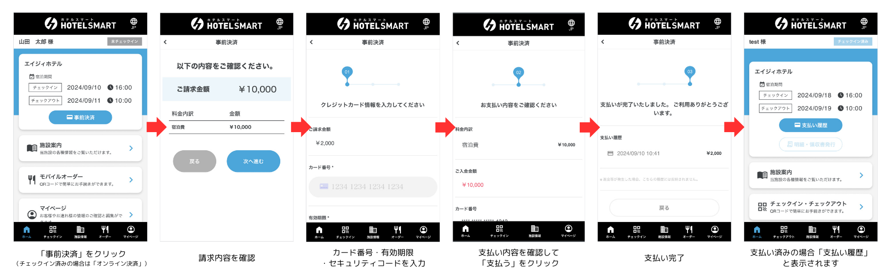 ①宿泊者様が「お客様マイページ」or「タブレット上」でクレジットカード(一部デビットカード)番号を入力