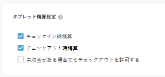 お客様マイページで決済させる場合は「マイページ決済」、チェックイン時/チェックアウト時に決済させる(*1)場合は「タブレット決済」にチェックを入れます。