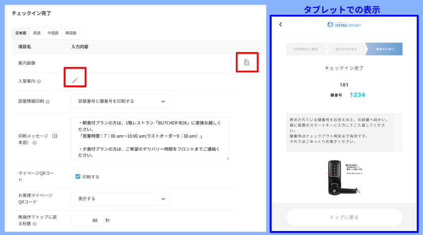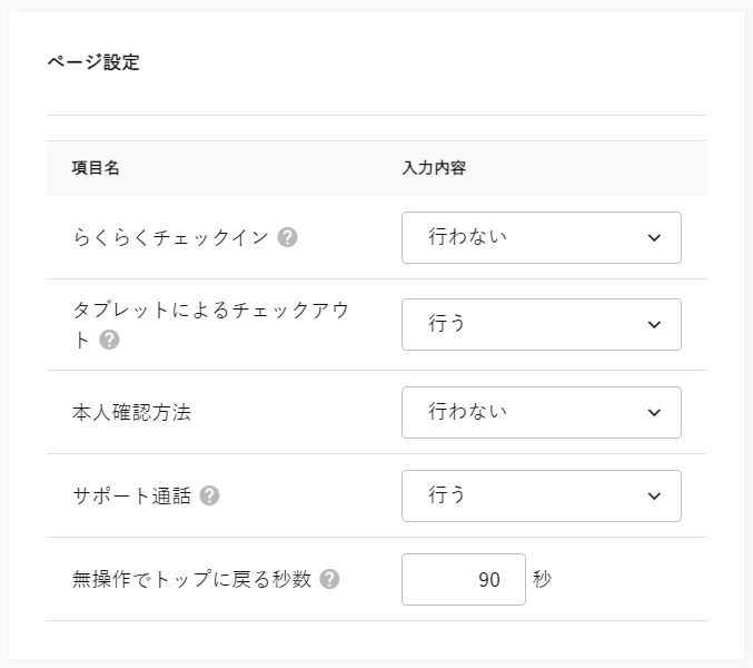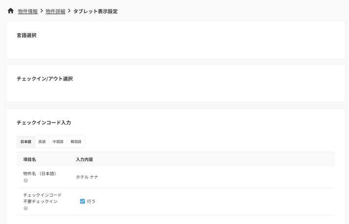 タブレット表示設定は、チェックイン/アウトで宿泊者様が操作するタブレットに表示する内容の設定をするページです。