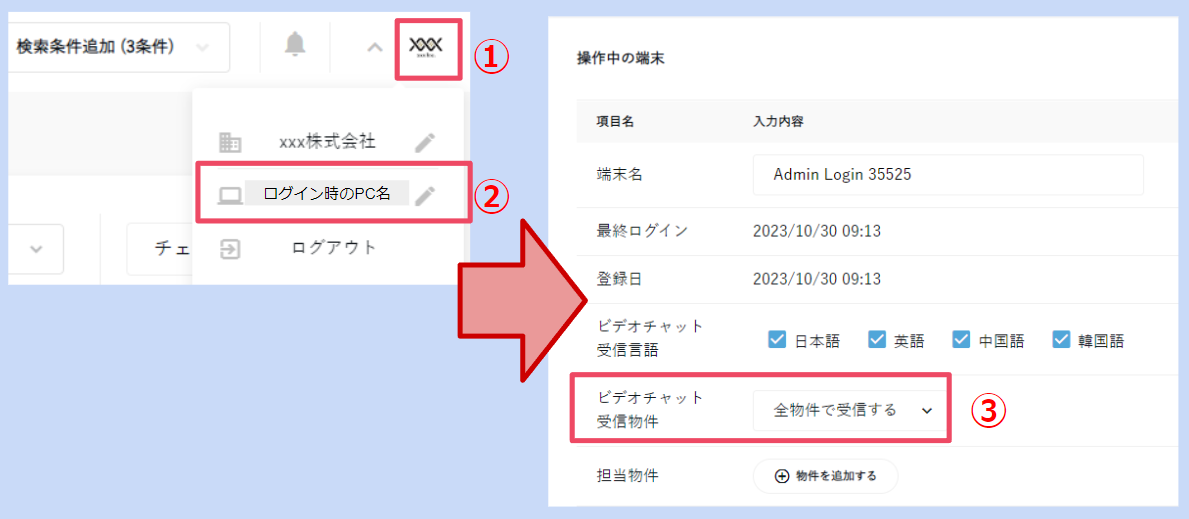 ①管理画面右上のアイコン>②真ん中のパソコンマーク>③【ビデオチャット受信物件】