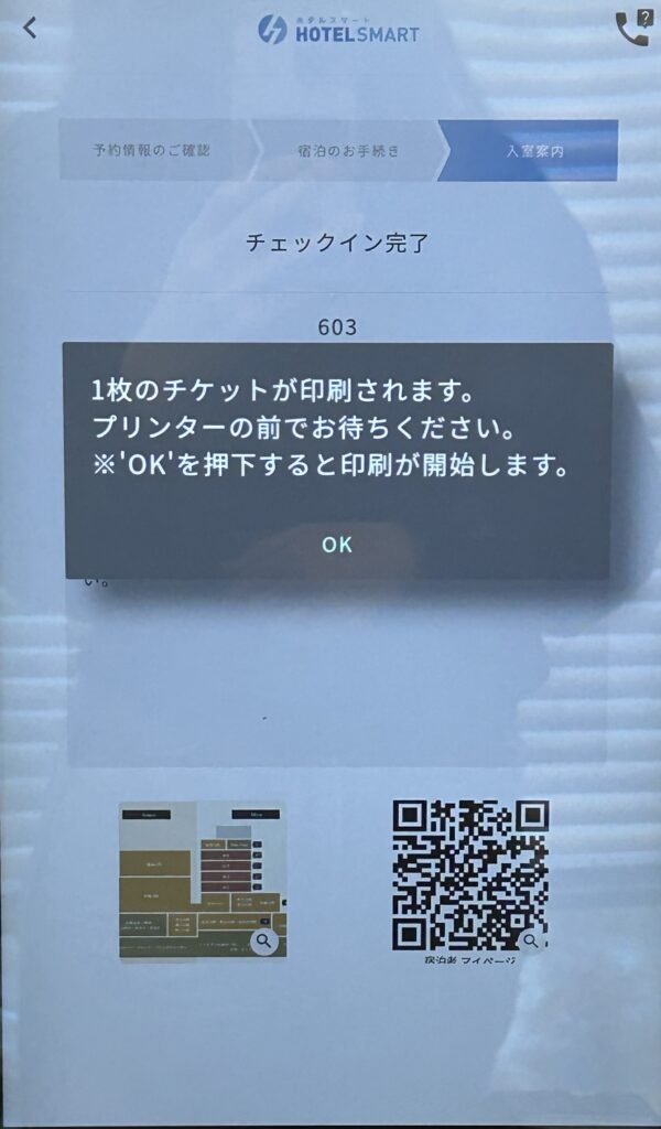 チェックイン完了画面にて「n枚のチケットが印刷されます。プリンターの前でお待ちください。’OK’を押下すると印刷が開始します。」と表示され、OKを押すと印刷されます。