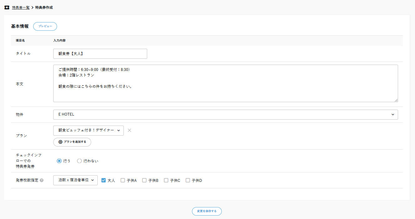 ・泊数×宿泊者単位:泊数×宿泊者の人数分の発券がされます ※発券対象(大人・子供A~D)の指定可