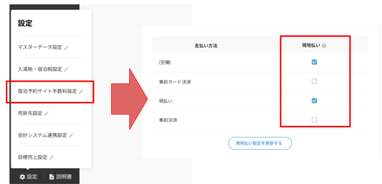 画面左下の「設定」>宿泊予約サイト手数料設定>右下にて[現地払い]のチェックが入っていないかご確認ください。