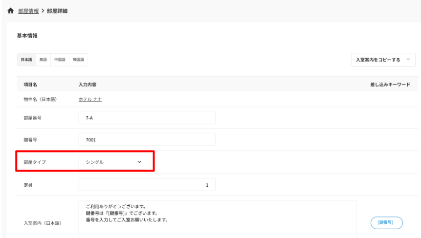 部屋タイプを変更する場合は、物件管理>部屋情報>詳細を見るより、各部屋で部屋タイプの選択が可能です。